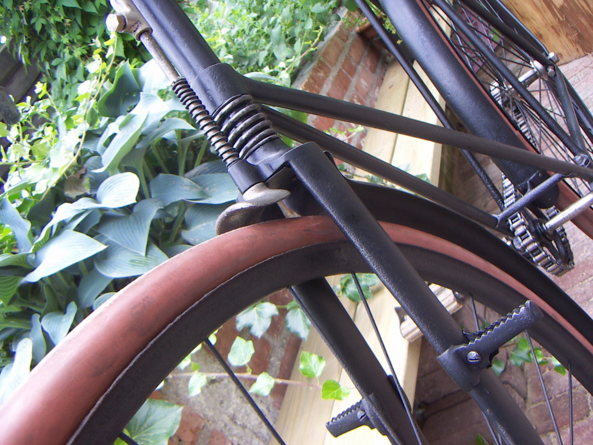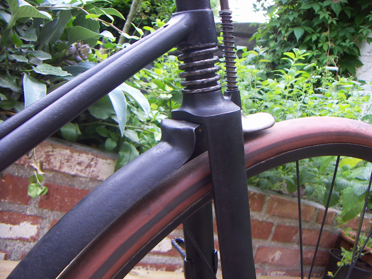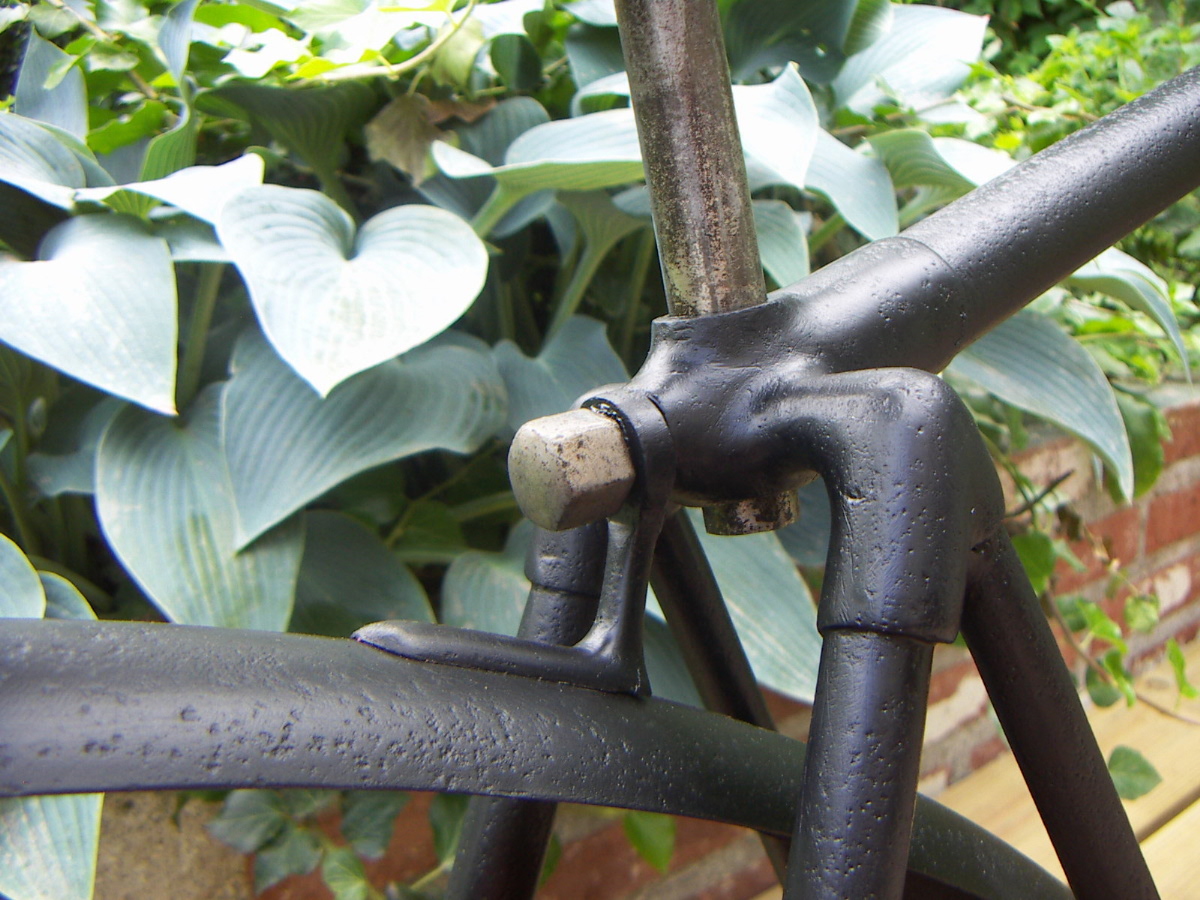 This Rudge bicyclette model H has a rare double tube frame. The bike is incredibly heavy, in fact it makes me think of a light motorcycle! The model is not unique for Rudge; we know of some French factories that built the same frame; these might be copies of the original Rudge design. This bike has socket steering (without balls). Rudge also made a version with pivot steering.